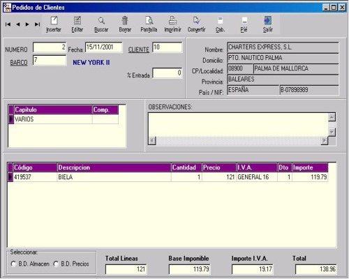 Dada la importancia de la venta para la empresa se ha realizado un trabajo a fondo en este apartado para que el proceso hasta llegar a la FACTURACIÓN sea rápido, informativo y sobre todo exhaustivo en el desglose de todos conceptos facturables. Así pues veremos que desde un PRESUPUESTO , o PEDIDO de un cliente se puede convertir automáticamente a ORDEN DE TRABAJO, ALBARÁN o FACTURA .Las ordenes de trabajo tienen especial interés ya que en ellas se imputan todas las horas utilizadas por nuestros operarios, así como los materiales utilizados. Todo ello organizado en capítulos para que los clientes entiendan perfectamente el desglose de todos sus trabajos. La información se visualiza como una especie de agenda día vista en la cual los trabajos no finalizados van pasando de un día a otro, hasta que se finalizan. En cualquier momento se puede saber todas las O.T. abiertas que tiene la empresa o bien todas las realizadas a una embarcación en concreto. Las ESTANCIAS se crean también desde una pantalla similar a las ordenes de trabajo y se pueden facturar en relación a los días y los m2 que ocupan. Convertir una estancia a factura es muy rápido.También podremos realizar ABONOS provenientes de una factura ya emitida. El DIARIO DE NAUTICA activo solo al entrar a la aplicación es un recordatorio de todas la varadas y botaduras que se tienen que realizar. Otras formas de ventas son : el TPV en el caso que tengan una tienda (funciona como cualquier punto de venta con reconocimiento de códigos de barras), las FACTURAS PERIODICAS en el caso que se quiera repetir alguna factura con una periodicidad fija. En cuanto a los COBROS quedará reflejado en la tesorería del cliente como, cuando y donde se ha realizado el cobro del cliente. En el caso de que el cobro lo queramos realizar con un recibo de cargo a su banco en DOMICILIACIÓN BANCARIA se crea el fichero para generar todos los recibos. Se dispone también de una amplia gama de listados configurados para proporcionarle la información necesaria en todo momento. |